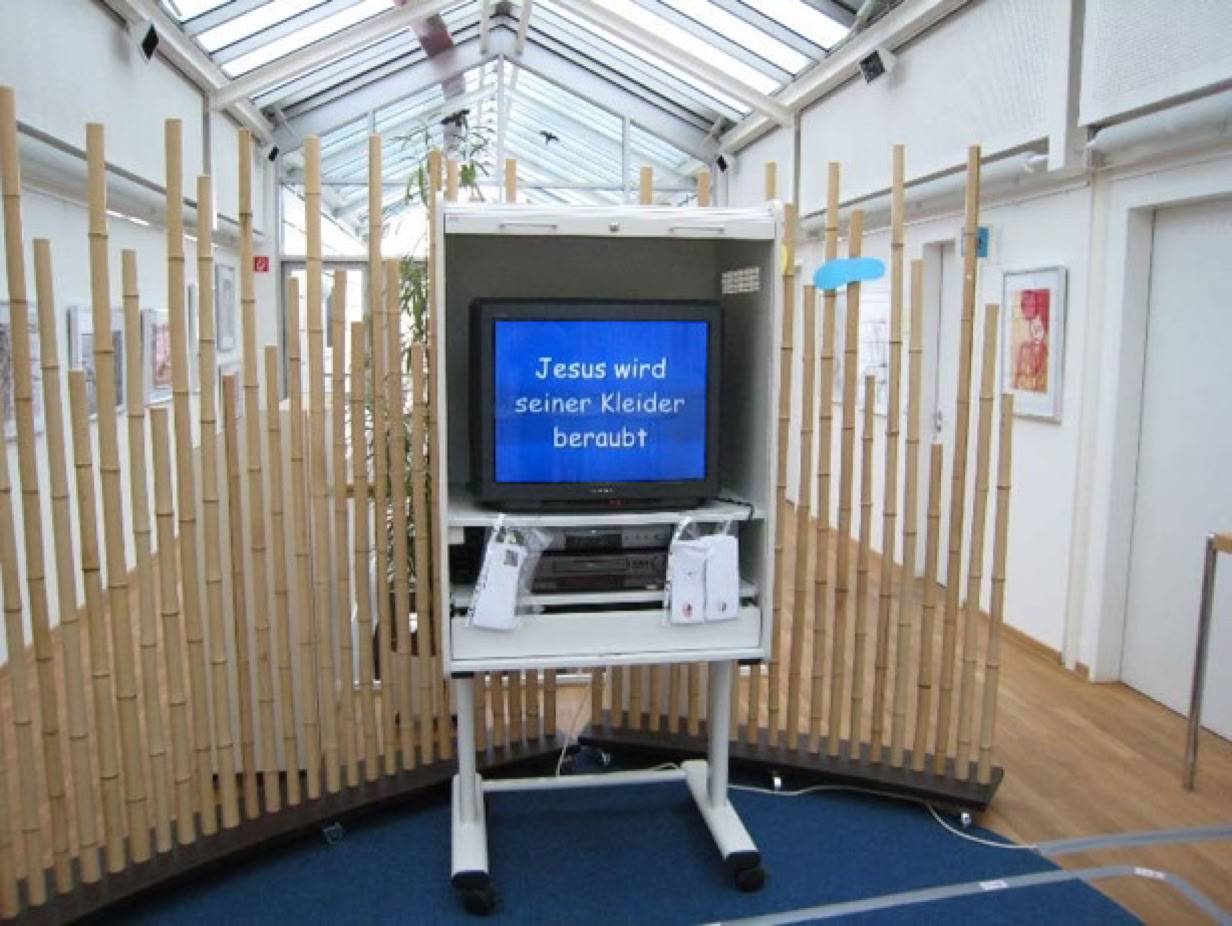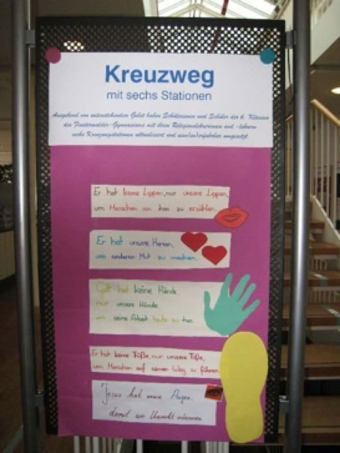Schülerinnen und Schüler der 5. und 6. Klassen beschäftigten sich in der Vorbereitungsphase intensiv mit Jesu Leiden und Sterben. Daraus entstanden fünf Projektgruppen, in denen versucht wurde, die Inhalte ausgewählter Stationen der Kreuzwegandacht auf die eigene Lebenswirklichkeit zu übertragen oder auf heutige Verhältnisse hin zu aktualisieren. In der Projektarbeit kamen unterschiedlichste Mittel zum Einsatz: Film, Hörspiel, Text, Bild und szenisches Gestalten. Die Stationen sollen dabei zum Weiterdenken und zum Gebet anregen.