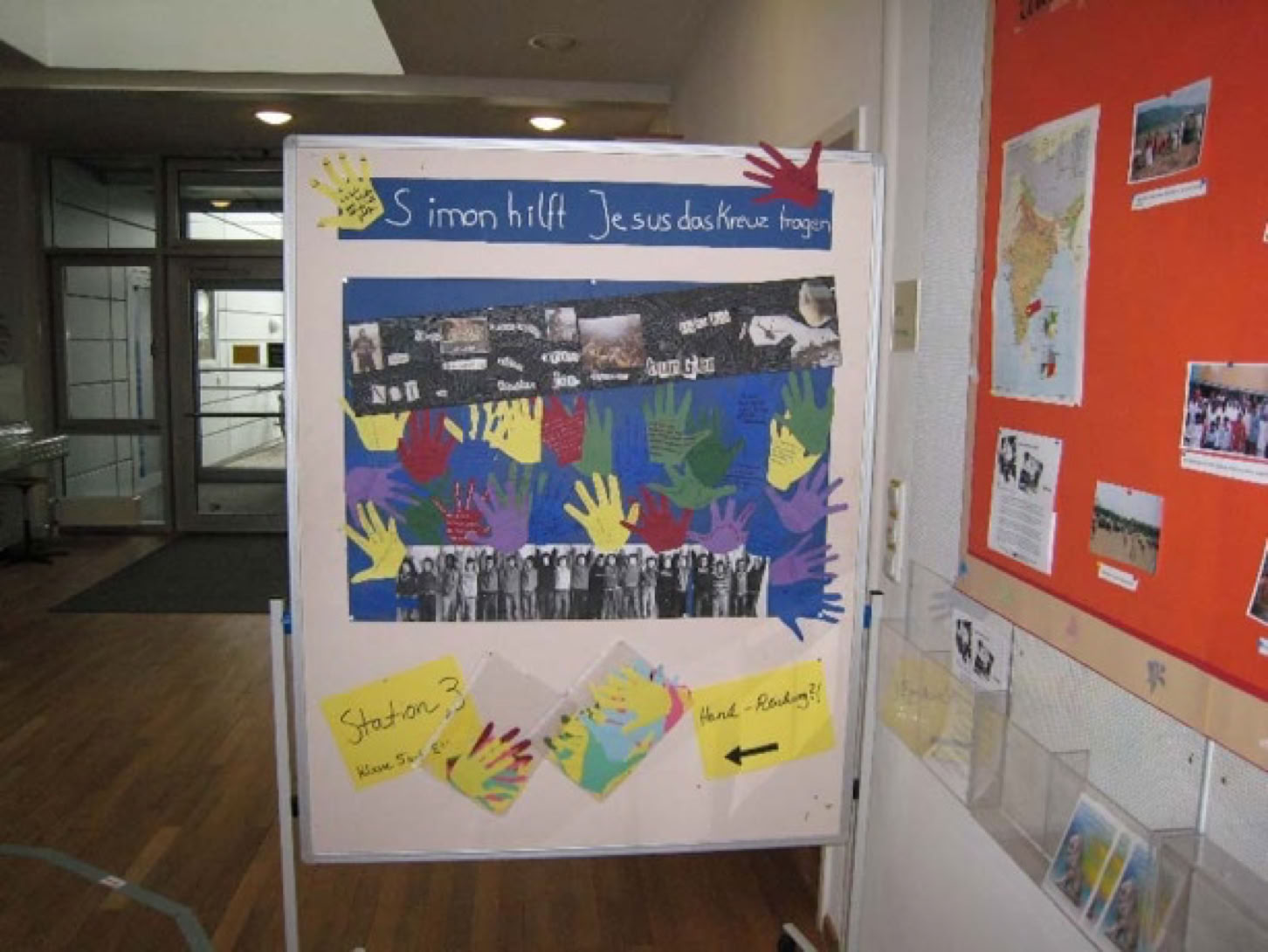 Die Station zeigt eine Fotocollage zum Thema "Hilfe, Hilfsbereitschaft". Die Schüler und Schülerinnen betrachten die Collage und äußern dazu ihre Gedanken zu den verschiedenen Bildern. Am Ende wird das "Symbol" Hand von den Kindern mitgenommen.