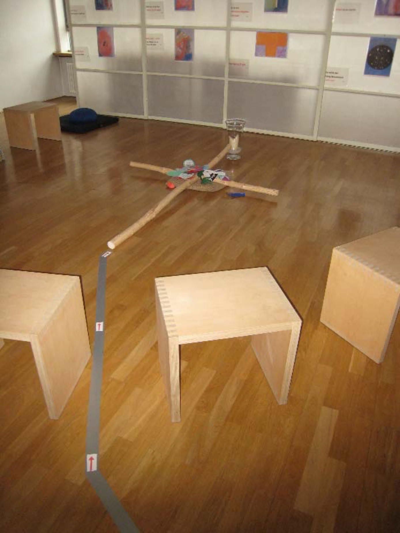 In einer darunter stehenden Schublade sind Begriffe und Beispiele für Schubladendenken auf bunten, laminierten Zetteln festgehalten. Wenn gewünscht können einige von den Schülerinnen und Schüler ziehen und die Begriffe vorlesen. Die Schüler nehmen eines oder mehrere Mund-Symbole mit und tragen sie bis zum Kreuz am Ende des Weges mit.